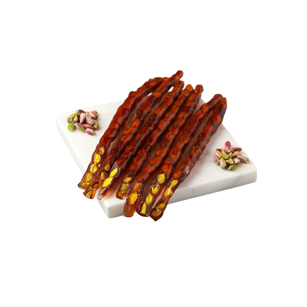 Antep Fıstıklı Sucuk; Cevizli sucuğun klasik lezzetine lüks bir dokunuş katıyor ve sizlere Kahramanmaraş’ın en özel tatlarından birini sunuyoruz: Antep Fıstıklı Sucuk. Geleneksel “sarkıt/çubuk” formuna sadık kalarak hazırladığımız bu ürün, iç dolgusunda ceviz yerine taptaze, iri taneli ve parlak yeşil Antep fıstıkları barındırır.